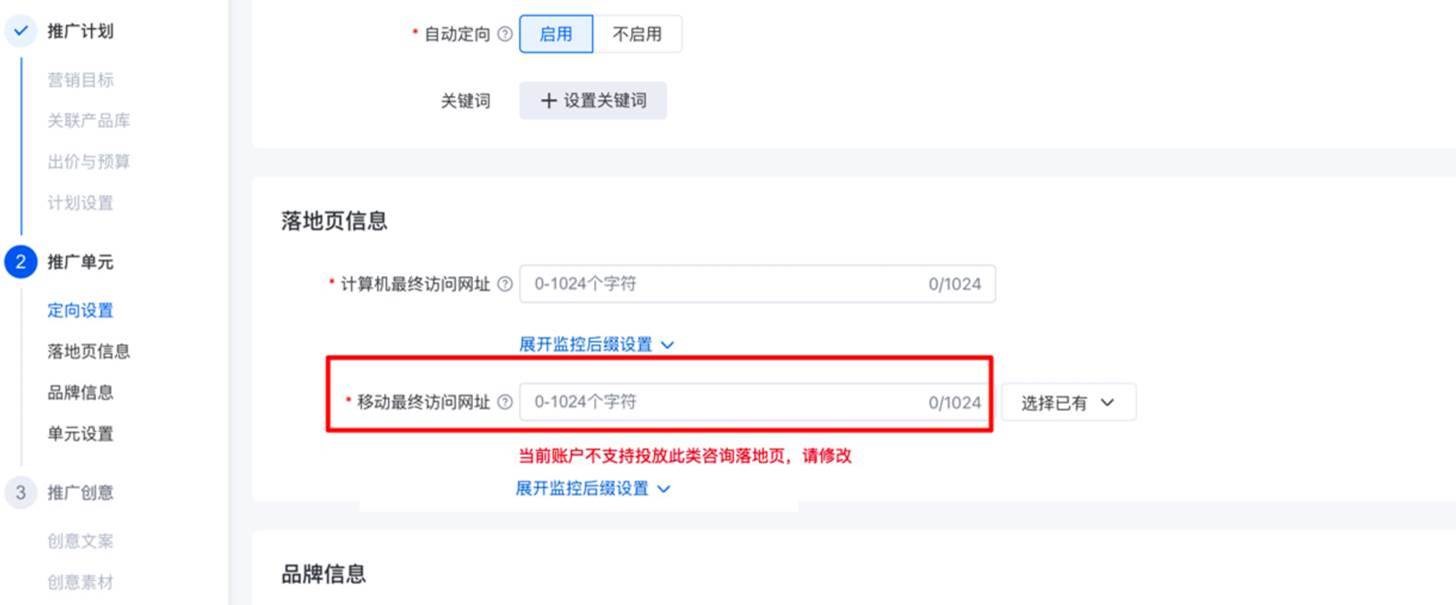 当账户属于“教育培训”一级行业下的所有二级行业 或“商务服务-法律服务”二级行业 或 医疗和医美强制托管名单内时,客户在搜索广告网站链接以及销售线索营销目标下的移动最终访问网址中,可填写ada咨询页进行投放(URL为ada.baidu.com/xxxx形式),其他不属于上述行业的账户,不支持填写,系统会提示:“当前账户不支持投放此类咨询落地页,请修改”。(其他行业客户若要投放ada咨询页,可用线上已有的程序化落地页组功能,将ada咨询页与营销页打包为程序化落地页组后进行投放,系统会自动从组里优选适合的落地页进行展现)