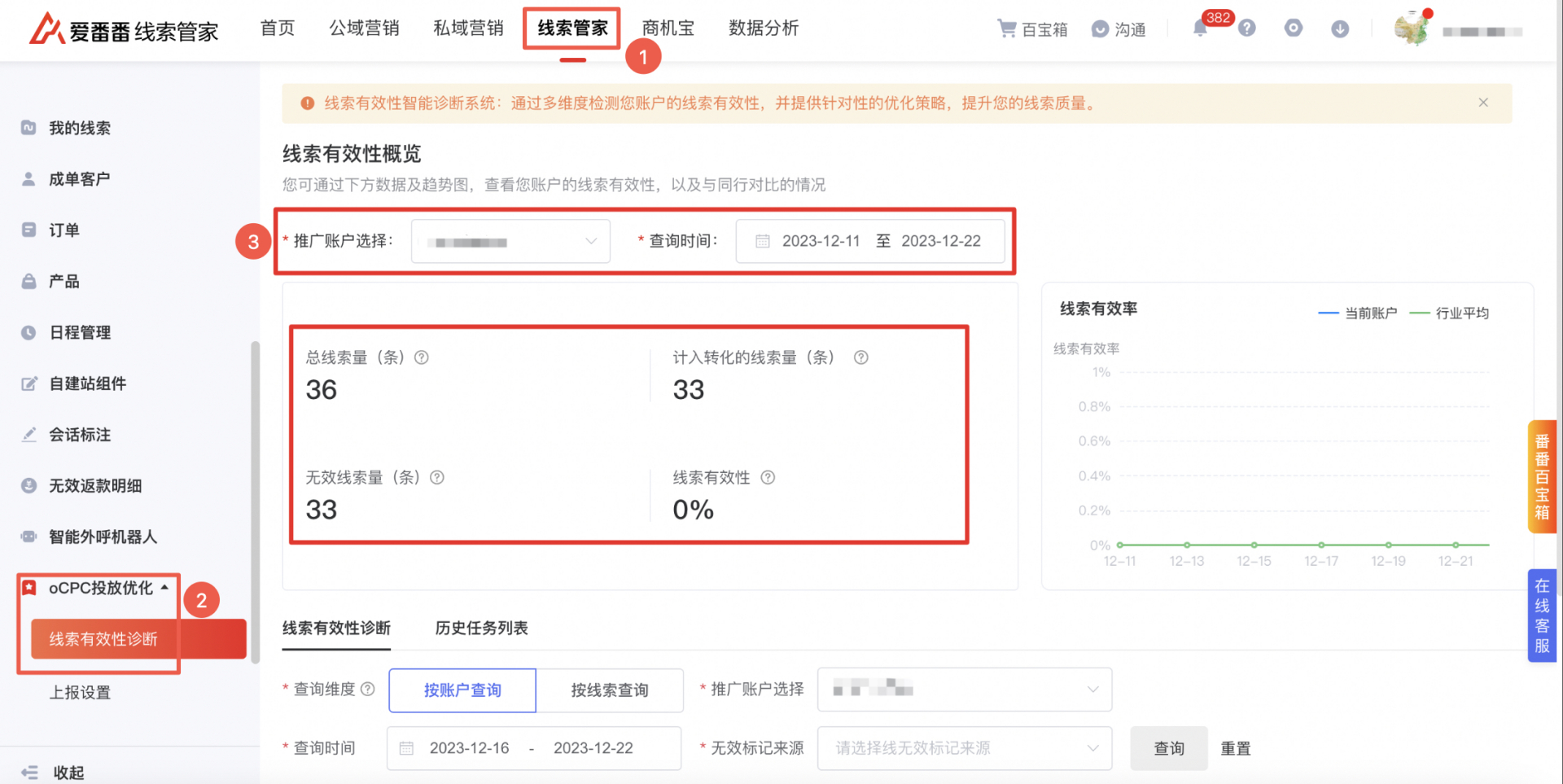 入口路径:您可以点击爱番番线索管家——选择oCPC投放优化——选择线索有效性诊断——选择【推广账户选择】和【查询时间】,支持查看不同推广账户、不同时间段内的线索有效率数据,以及与同行相对比的情况。
