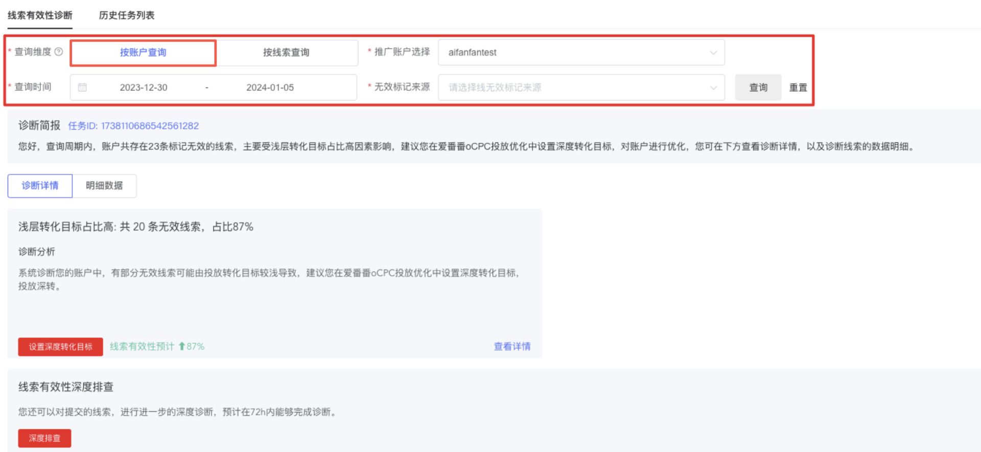 入口路径:您可以点击爱番番线索管家——选择【oCPC投放优化】——选择【线索有效性诊断】——选择【按账户查询】,您需要输入推广账户名称、查询时间和无效标记来源。