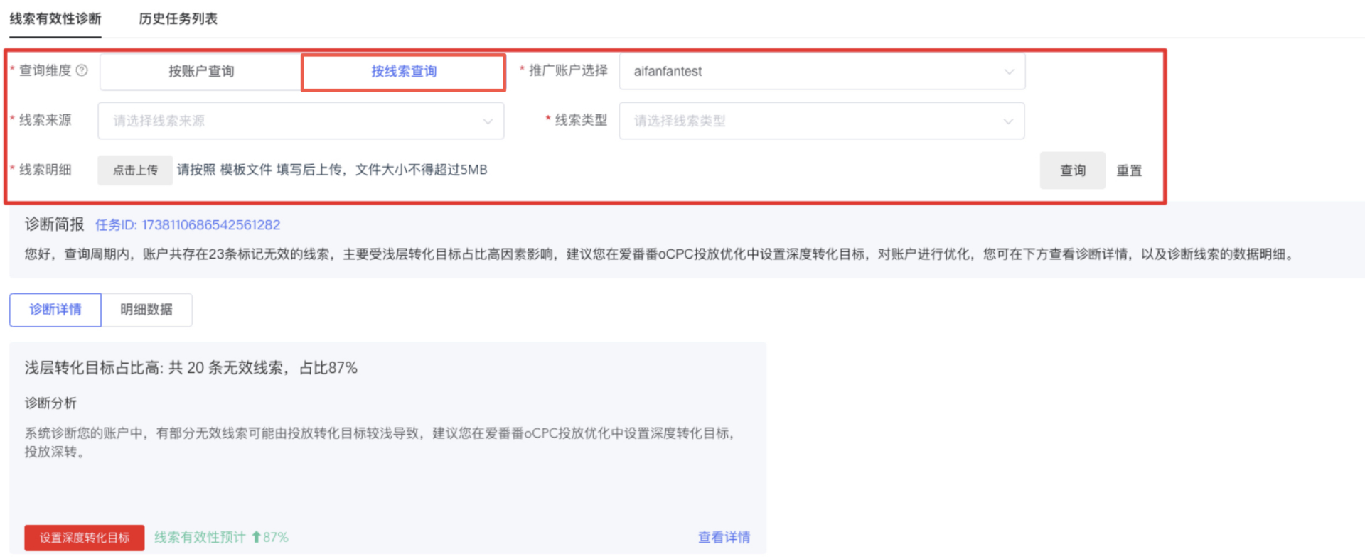 入口路径:您可以点击爱番番线索管家——选择【oCPC投放优化】——选择【线索有效性诊断】——选择【按线索查询】,您需要输入推广账户名称、线索来源、线索类型并上传线索明细。(您需要先选择线索来源、线索类型后才可以下载上传模版)