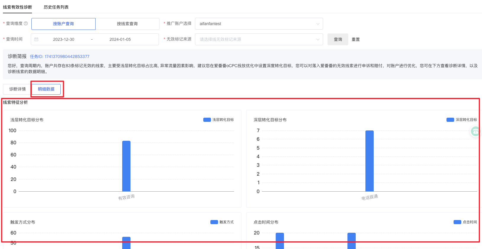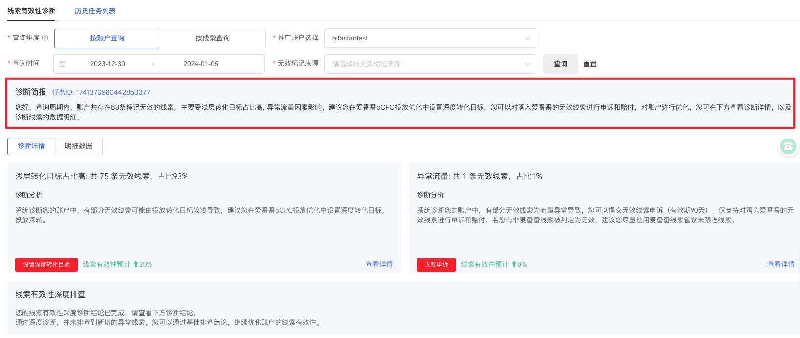 诊断完成后,您可以查看诊断详情,诊断详情将以卡片形式,展示您的诊断任务,包括:线索数量统计、诊断分析说明以及对应的投放优化建议。
