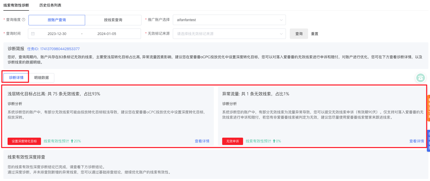 ①诊断维度丰富:提供多维度数据化归因能力,包含异常流量、流量匹配、用户意向度、投放功能使用4类,支持按账户查询和按线索查询2类诊断方式;