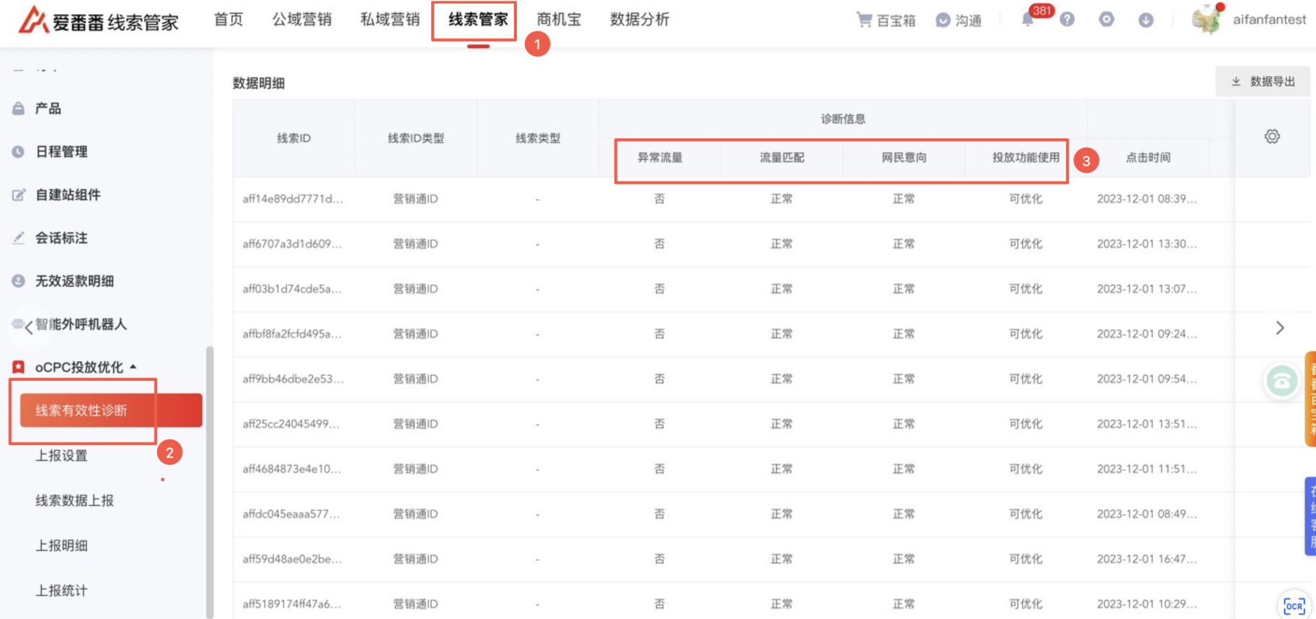 您可以点击爱番番线索管家——选择【oCPC投放优化】——选择【线索有效性诊断】——点击查看【明细数据】