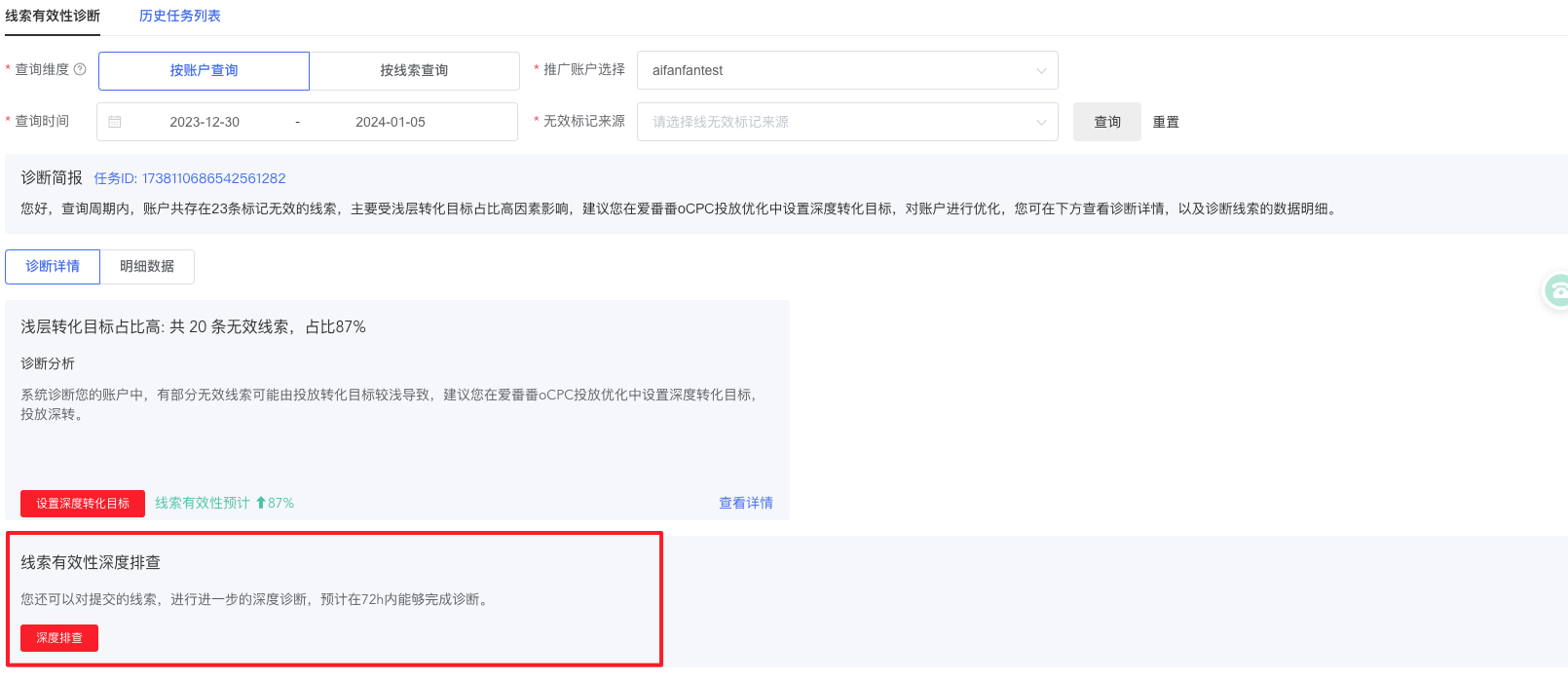 在进行基础排查后,如果您对诊断结论仍有疑惑,可在【深度排查】模块对无效线索产生的原因进行深入排查,预计耗时24~72h,后续您可通过历史任务,点击查看详情可以返回诊断详情,系统可能会为您发现新的异常线索。