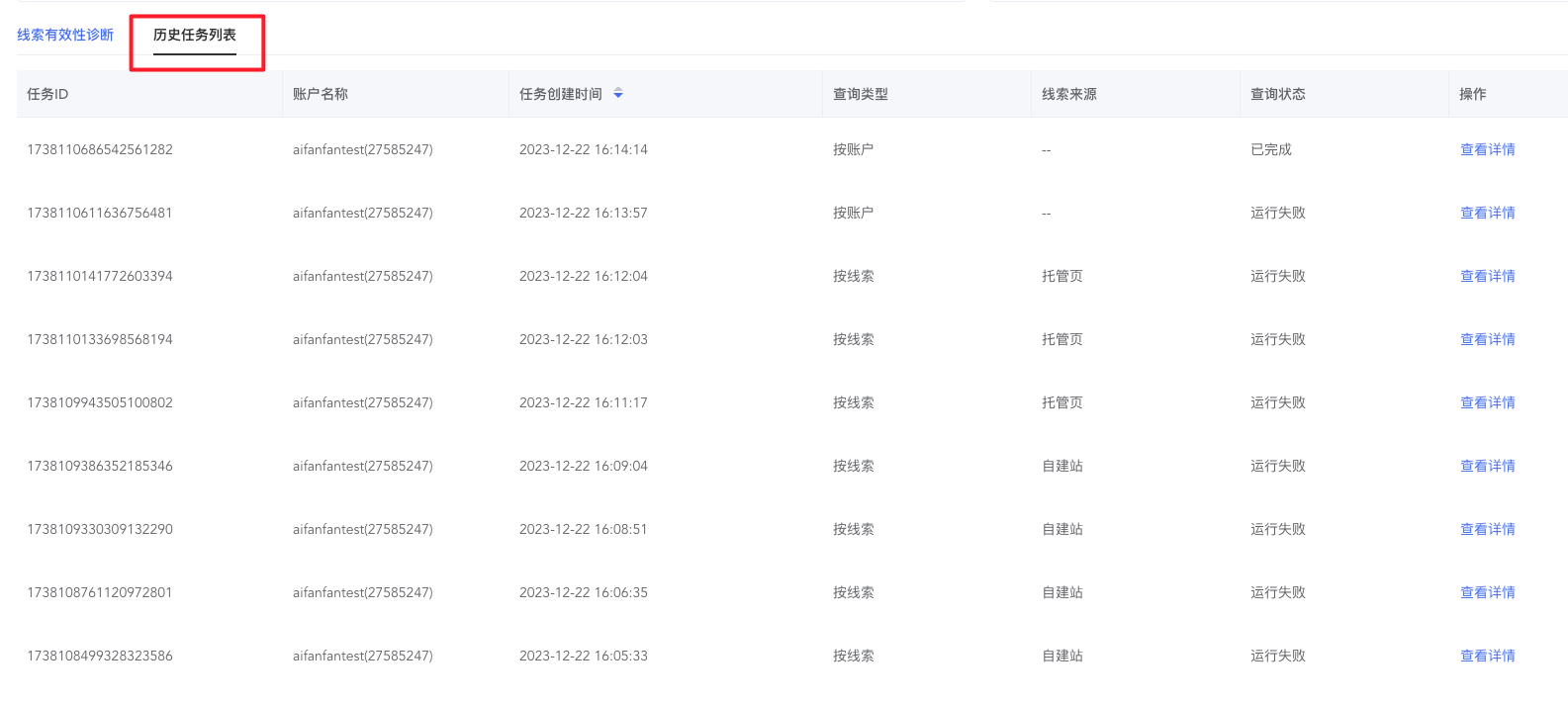 由于为您的账户进行线索有效性诊断需要一定的时间,所以可以通过【历史任务列表】重新回溯您之前提交的诊断任务,以此来确认诊断结论或赔付进展。(历史任务列表可以回溯的时间无限制)