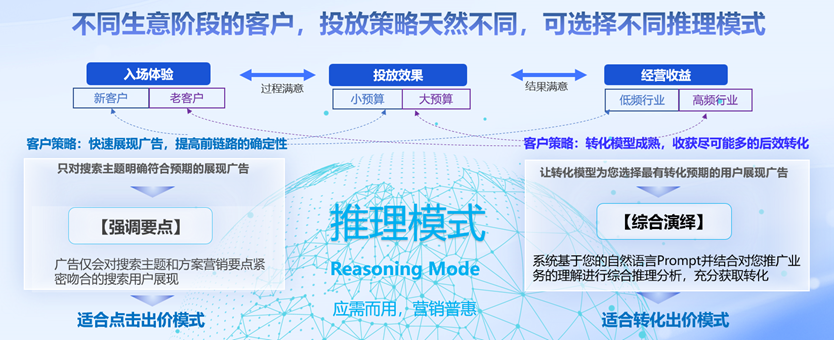 智能体会基于对您过去投放习惯和行业特色的理解,为您默认选择推理模式。 也就是说,当在轻舸新建方案时,选择优化目标后,系统将综合您的过往投放习惯、您所在行业的普遍特征,及您当前的营销诉求,为方案默认选择一种契合的推理模式。(通过“搜索推广--一键试投轻舸”工具创建的方案,及本功能上线前已创建的方案,均会被赋予推理模式的设置)