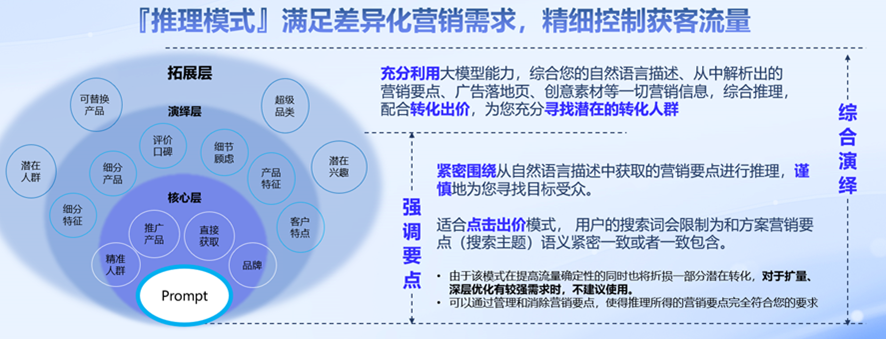 - 强调要点:系统将紧密围绕从您自然语言描述中获取的信息要点(即营销要点)进行推理,谨慎地为您寻找目标受众。强调要点模式比较适合点击出价场景,您希望广告仅对搜索词主题需求紧密符合营销要点的用户展现广告。由于强调要点模式在提高流量确定性的同时也将折损一部分潜在转化,若您对扩量、深层优化有较强需求,则不建议您使用此模式。