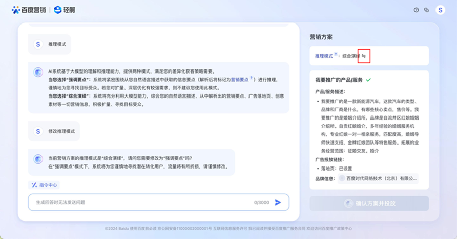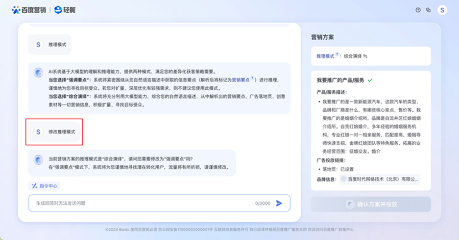 轻舸鼓励“放开说”,通过自然语言表达推广业务和目标受众,为满足差异化的获客策略需要,本次推出“推理模式”功能,您可以根据营销需要为投放方案选择如下两种推理模式——