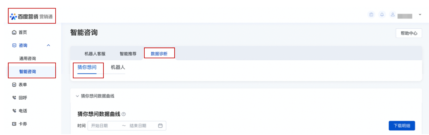 入口:营销通-咨询-智能咨询-数据诊断-猜你想问
