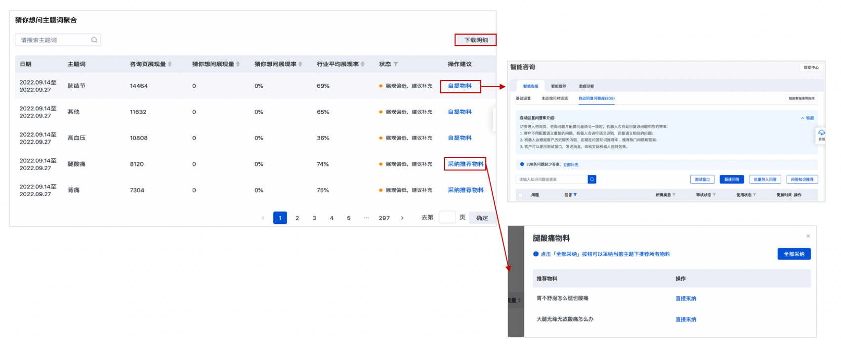 * “采纳推荐物料”: 当展现率低于行业均值,策略挖掘该词的常见问题并进行推荐,客户可以自行采纳;
