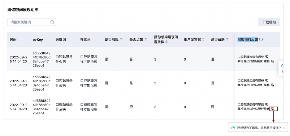 1)按疾病词(含机构词)维度进行聚合,展现所选时间段内的咨询页展现量、猜你想问样式的展现次数、猜你想问样式的展现率等数据,帮助客户辅助客户有针对性的提升展现率;
