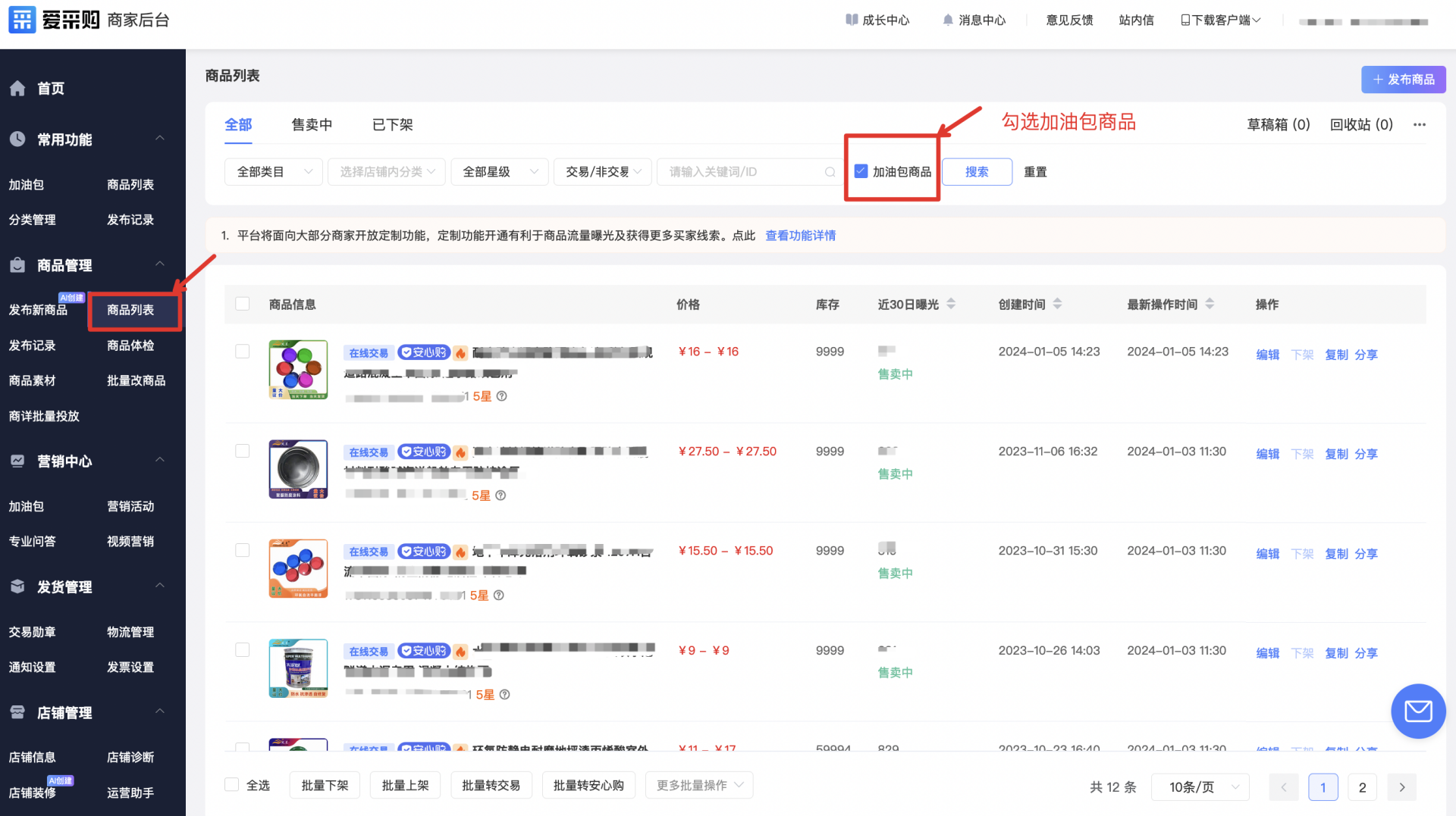 进入【PC商家后台-商品管理-商品列表】勾选加油包(推)商品并点击搜索,即可查看当前加油推营销商品的星级情况。