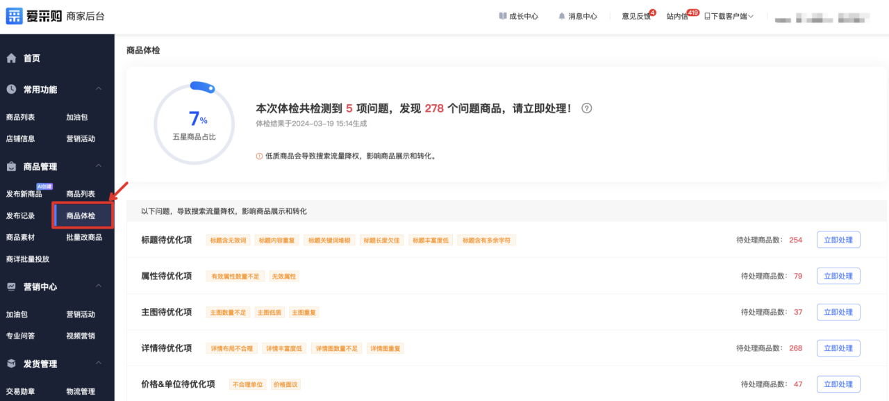 进入【PC商家后台-商品管理-商品体检】查看该营销商品是否存在问题,根据标题、属性、主图、详情、价格&单位等待优化项进行优化。