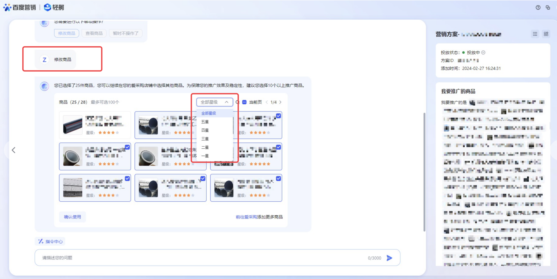 进入【轻舸平台进入加油推营销方案-对话框输入/选择「修改商品」-可通过选择「全部星级」以调整商品】,建议优先选择【4星及以上商品】,并且选择25个以上的商品加入加油推营销方案。
