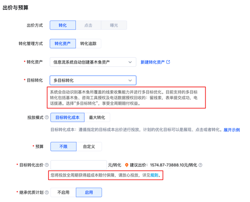 使用「多目标转化」目标转化可享受全周期超成本赔付保障——全流量上线