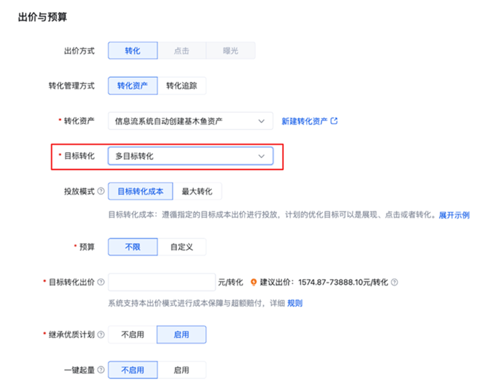在信息流推广投放中,如果客户的事件管理中包含基木鱼资产或者转化追踪中包含“表单提交成功”、“电话拨通”、“留线索”转化目标,当选择销售线索营销目标时,项目层级会默认选择「多目标转化」目标转化,计划层级会默认为客户选择一个符合条件的转化资产或转化追踪,且默认勾选「多目标转化」作为转化目标,使用『多目标转化』后,系统将自动识别基木鱼落地页当中的“表单提交成功”、“电话拨通”或“咨询留线索” 并进行多目标优化,提升整体转化数量。