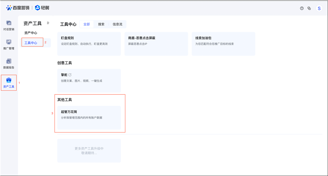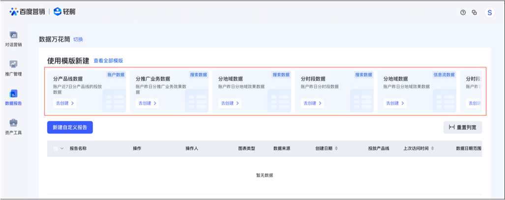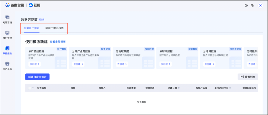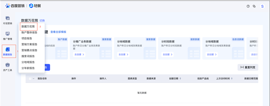 ①数据万花筒入口:推广账号直接登录,客户中心管理员需跳转,进入轻舸平台-数据报告-数据万花筒,帮助您获取不同维度的数据。