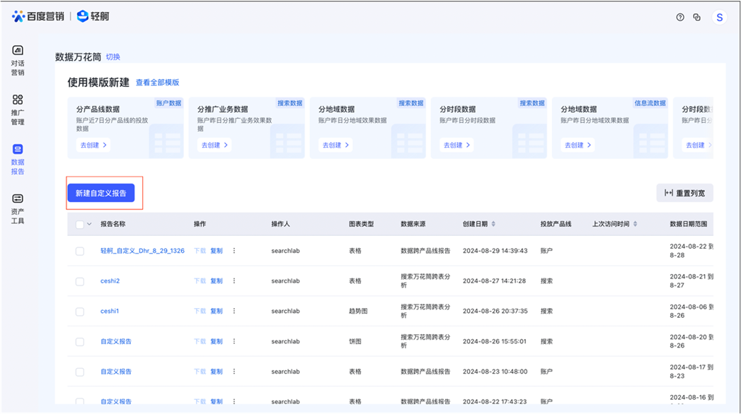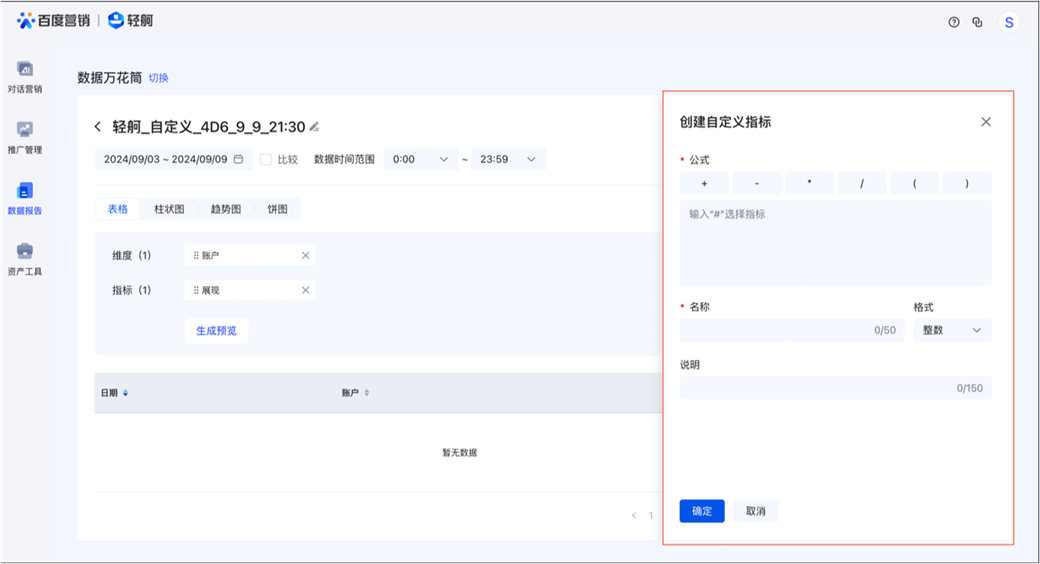 1、更便利的自定义功能,效果一目了然:轻舸数据报告模块导航首位即为数据万花筒,方便客户快速自定义报告,支持自选数据来源、维度、指标,自定义生成指标,生成可视化图表(柱状图、饼图、趋势图等);支持按推广业务维度聚合分析数据;可查看搜索推广、信息流推广、爱采购、服务直达等全产品线投放数据无需跨多个平台获取数据;各维度均支持独立聚合,方便客户更全面地根据自身需要,了解关键指标变化。如果有特殊指标不在指标明细中您还可自定义指标;