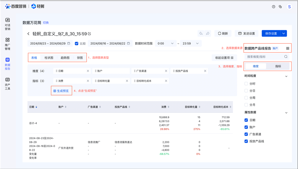 您可以点击数据万花筒-新建自定义报告,选择图表类型、数据来源、维度、指标后,点击生成预览,完成报告的创建。另外,本次数据万花筒支持生成表格、趋势图、柱状图、饼图。