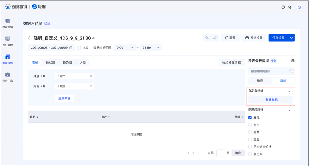 注意:自定指标入口必须在您保存报告的基础上可以生成。