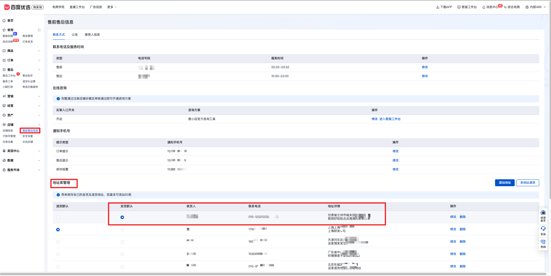 商家通过设置地址库,来设置自己的发货地址和收货地址。