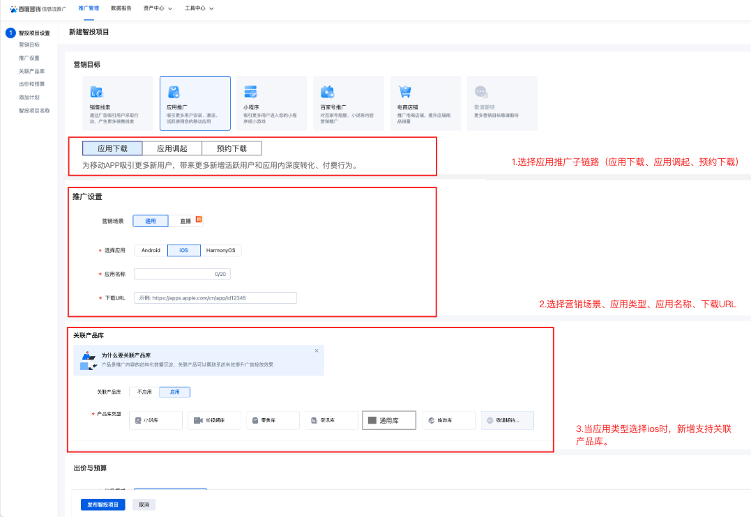 应用推广营销目标下,当选择应用类型为IOS时,支持关联产品库,包括:长视频库、小说库、资讯库、通用库等。