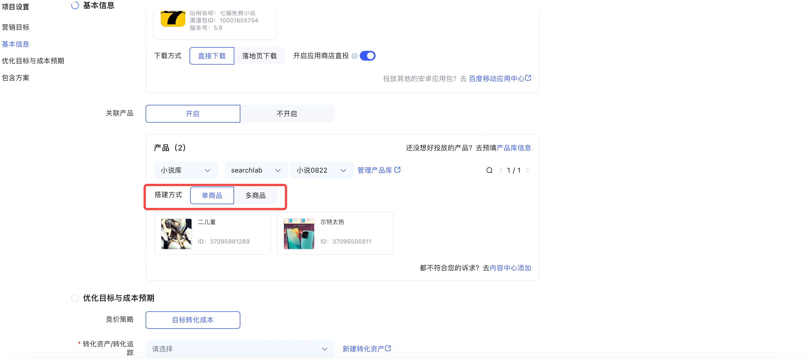 单元层级关联多商品:当用户在计划层级关联了产品库后,在单元层级可以继续设置“搭建方式”、“投放商品”(即:在项目、单元层级均可设置“搭建方式”、“投放商品”)。注意:在项目、单元层级同时设置时,优先以单元层级为准。