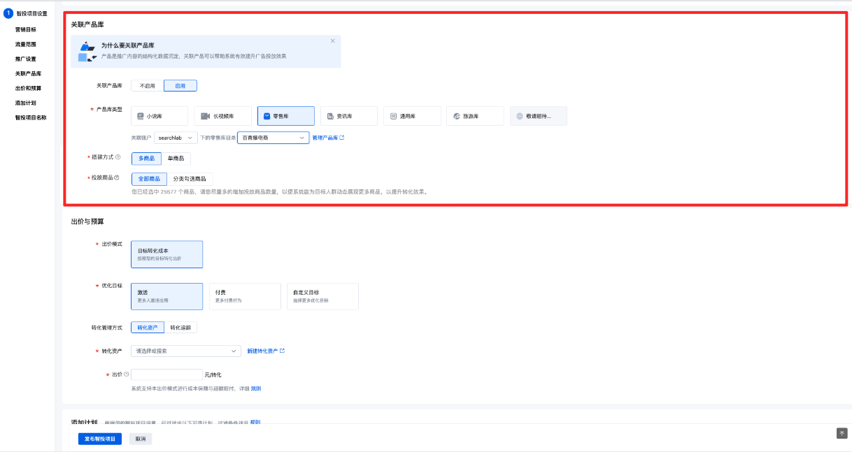 ②计划(方案)层级:存量计划可以选择加入已设置多商品的项目;或者新建计划不加入项目,选择流量进行多商品广告投放。