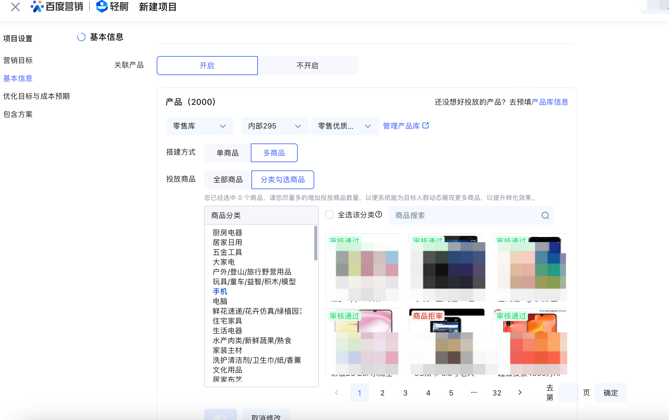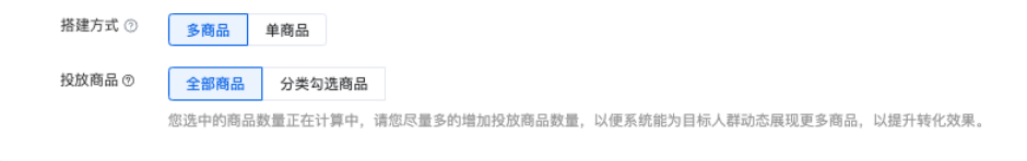 b.多商品场景:当用户选择关联多商品的时候,可以选择全部商品、或者分类勾选商品进行多商品投放。
