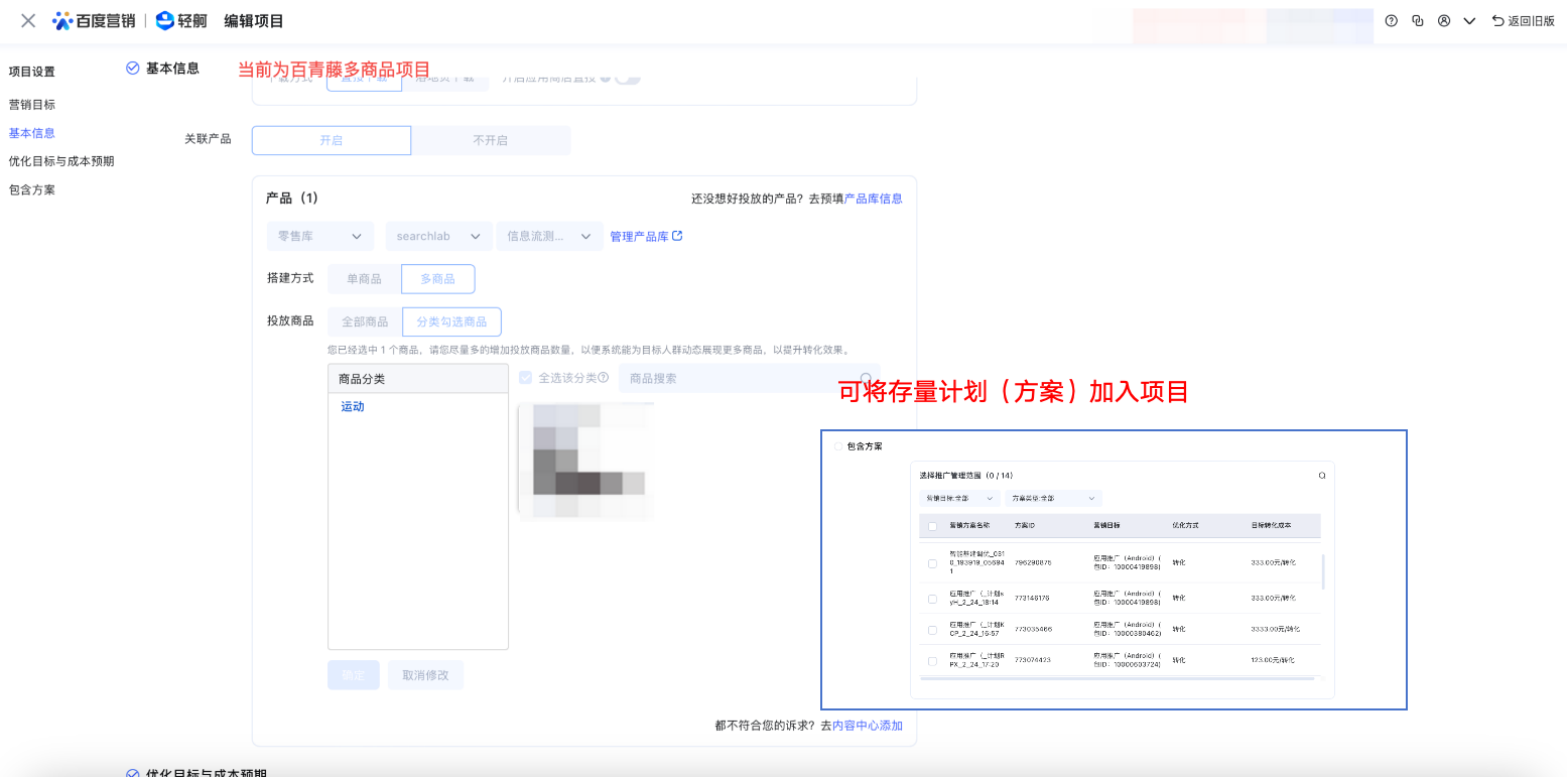 针对已加入百青藤关联多商品项目的计划,用户可修改加入其他项目,但是计划的“投放范围”默认无法修改,依然为百青藤。