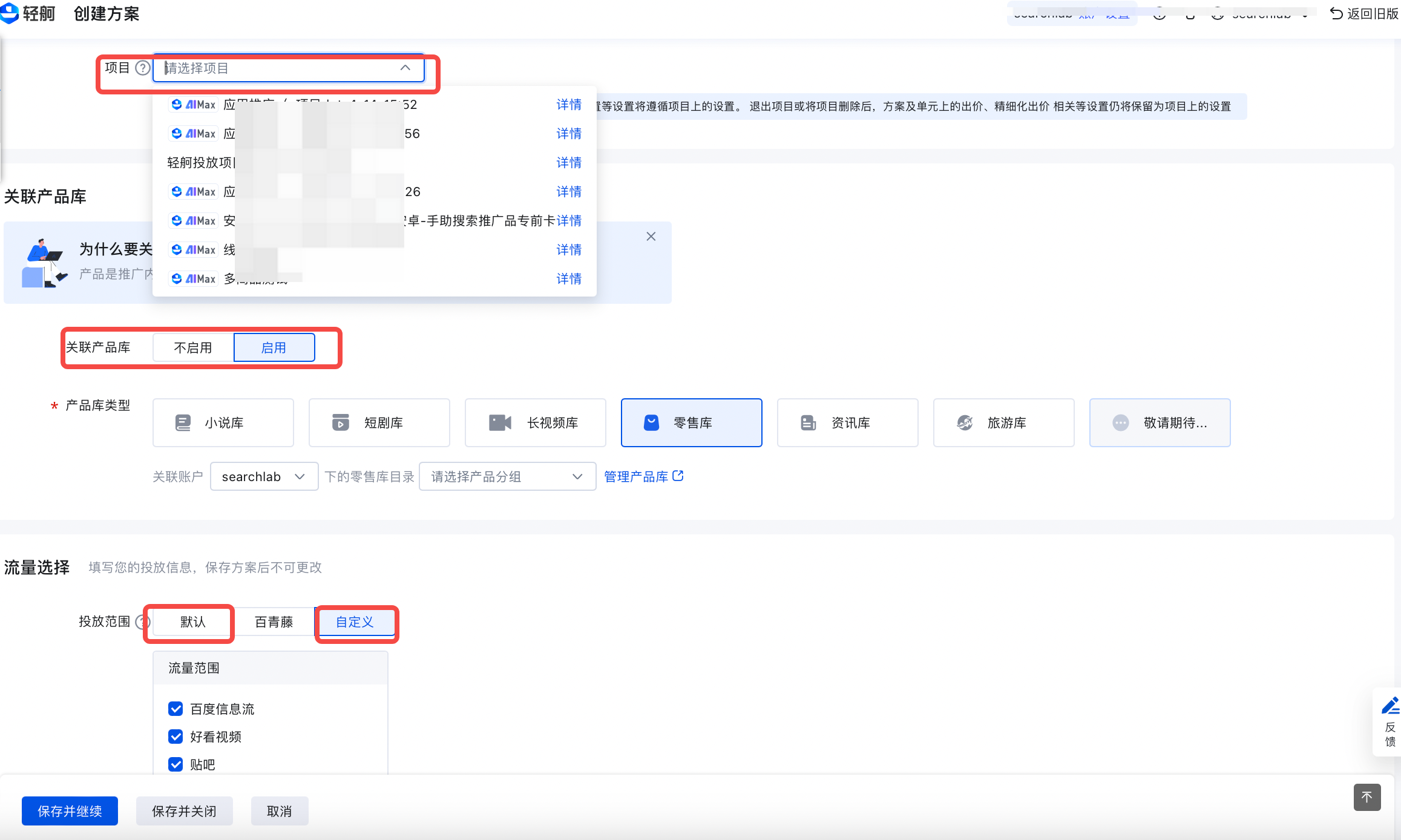 当用户手动选择计划的“默认”或者“自定义”的流量范围时,可选择的加入项目会自动过滤为非百青藤关联多商品的项目。