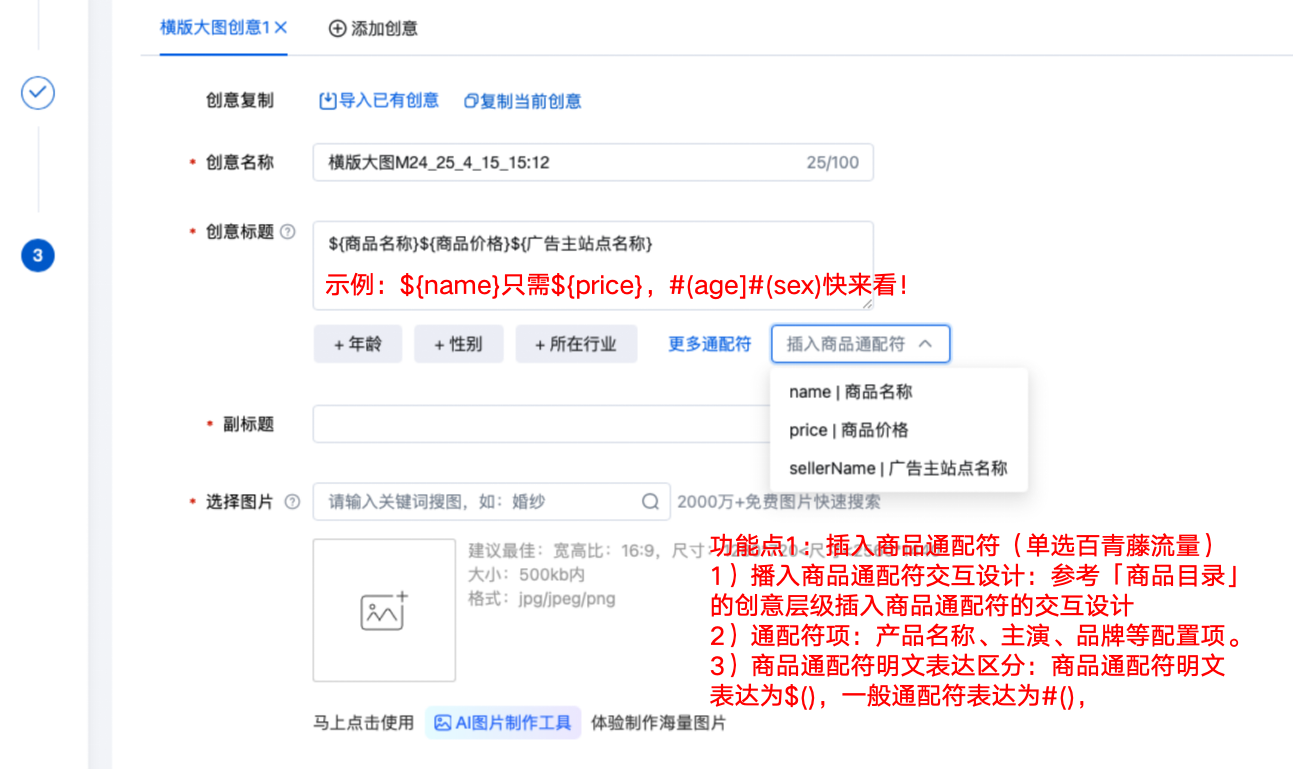 ④创意层级,创意标题新增支持插入电商和长视频的商品通配符。