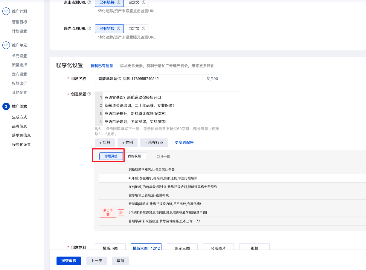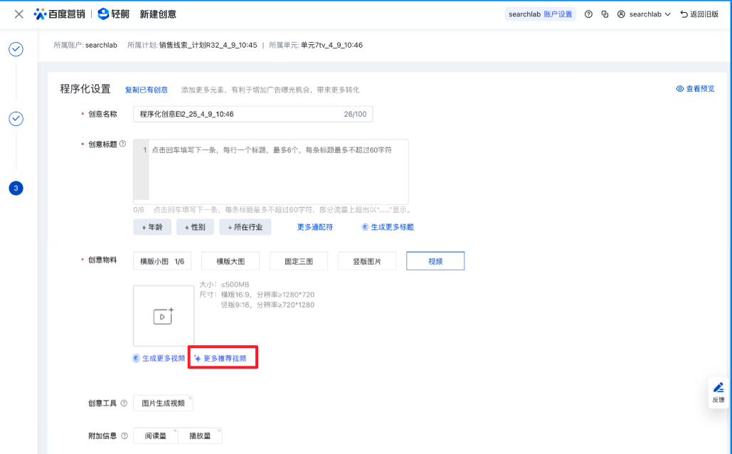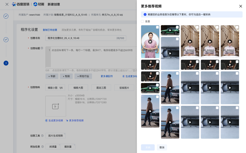 入口:创意新建、编辑页面——>点击【更多推荐标题】、【更多推荐图片】、【更多推荐视频】