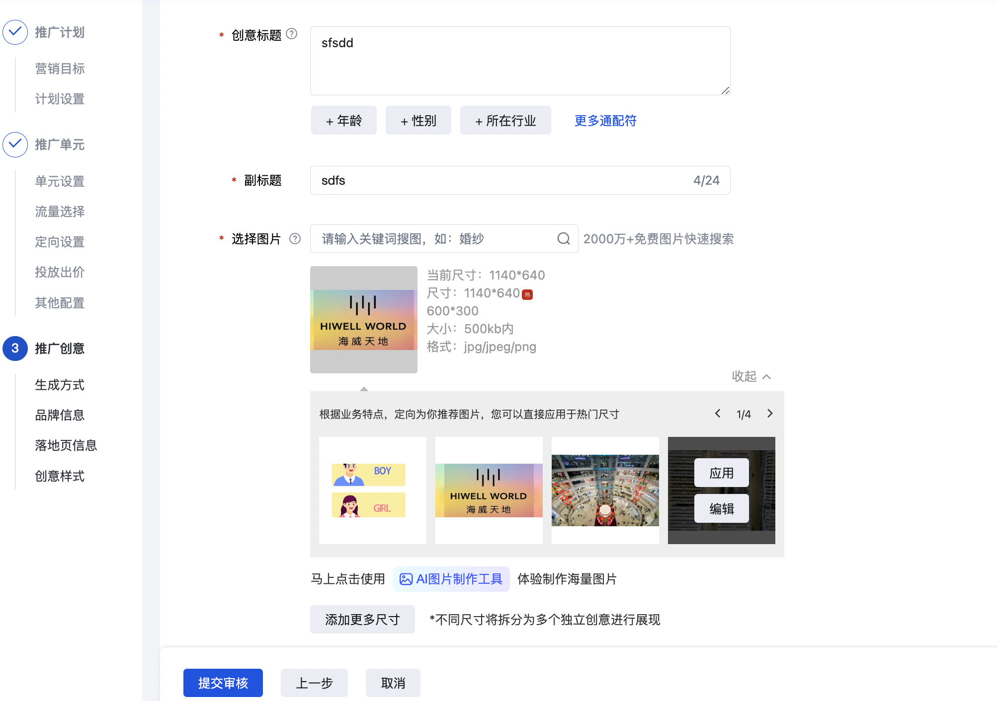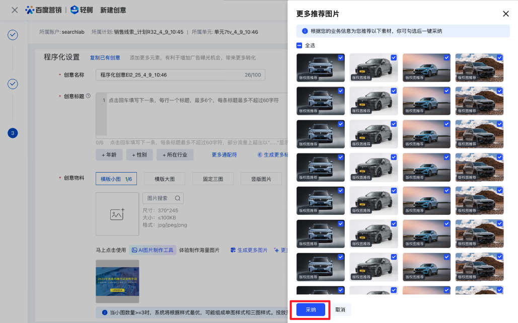 标题、图片:支持全行业,系统会根据您的落地页信息、业务信息检索图片;