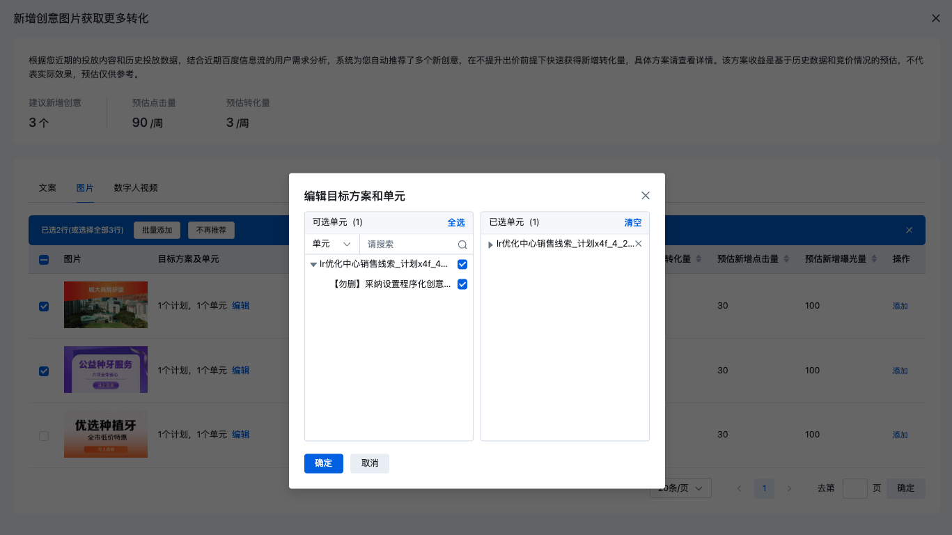 - 优化中心会为您推荐【新增创意图片获取更多转化】优化建议,您可以点击目标方案及单元列后的【编辑】按钮编辑目标单元;