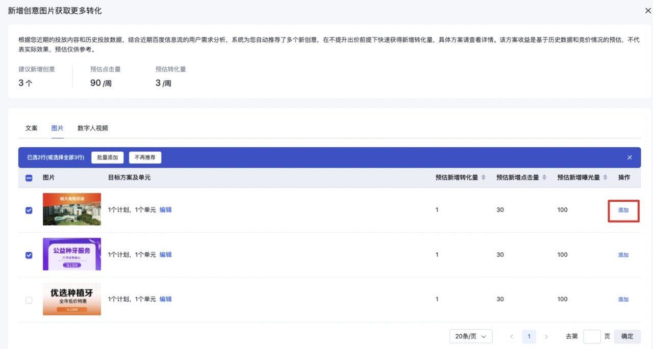 A2:根据您近期的投放内容和历史投放数据,结合近期百度信息流的用户需求分析,系统为您自动推荐了多个新图片,在不提升出价前提下快速获得新增转化量。