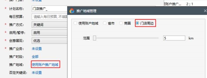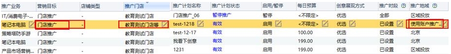 计划层级-编辑门店计划:可在列表区和编辑区查看、编辑推广地域、推广门店;列表区营销目标一列可查看、筛选“门店计列表区