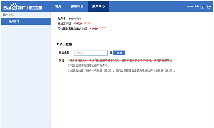 离线宝余额以推广账户-推广资金池【离线宝冻结】现金余额为准,查看路径:登录,页面右侧查询推广余额,点击推广资金池查看具体金额,可见下方示例图1-2;离线宝平台内的转出金额为离线宝余额,不可二次编辑。需一次性转出,不可分次操作;