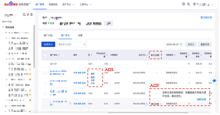 入口1:推广单元列表-操作列-点击“:“后调取下拉菜单-点击“诊断”后调起诊断面板;