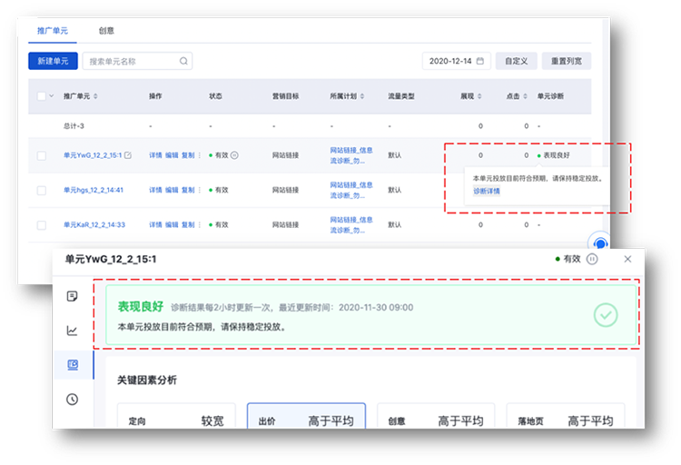 上述结果指标可在物料列表-推广单元-【单元诊断】指标中查看(如下图,点击【诊断详情】可唤起诊断面板),也可以在诊断面板的上部结果区查看。