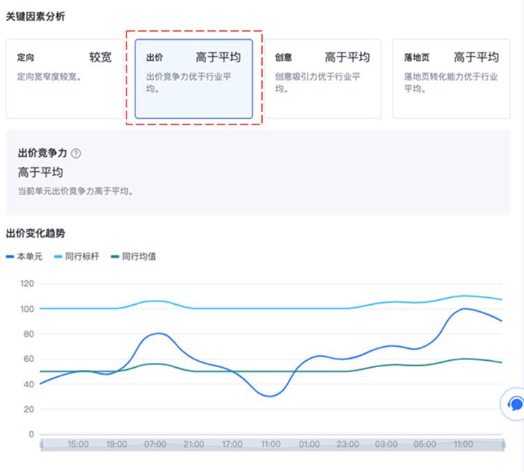 出价:提供出价分析与结论,披露出价竞争力,支持同行标杆、同行均值对比趋势图