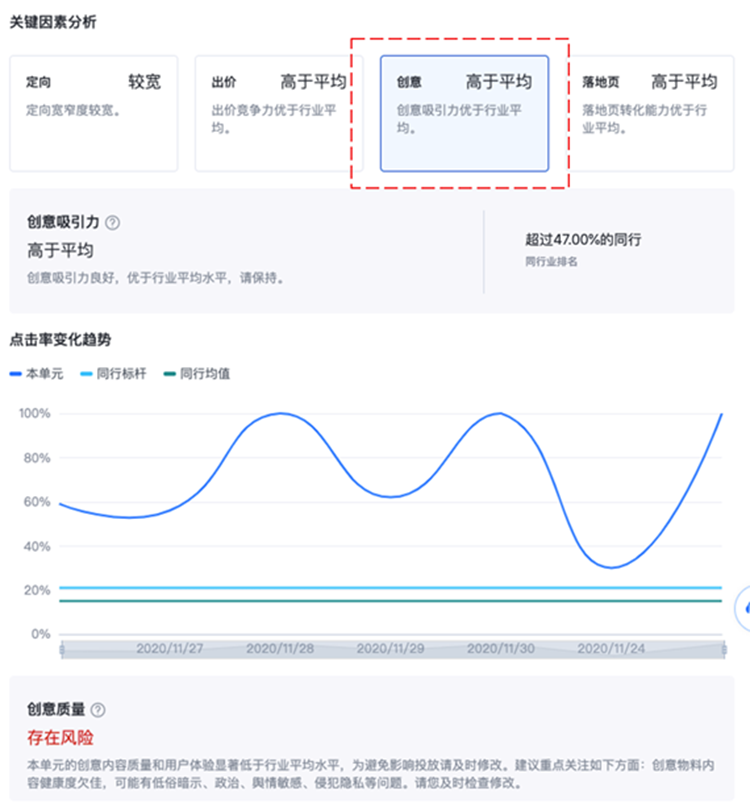 创意获取点击能力是单元点击效果指标,通过绝对值及同行业排名,定位单元点击率表现情况;创意质量是对当前单元所投放的创意素材质量、用户体验进行综合分析评估的指标,分析结论反映最近该单元的创意质量在百度系媒体投放时的综合表现)