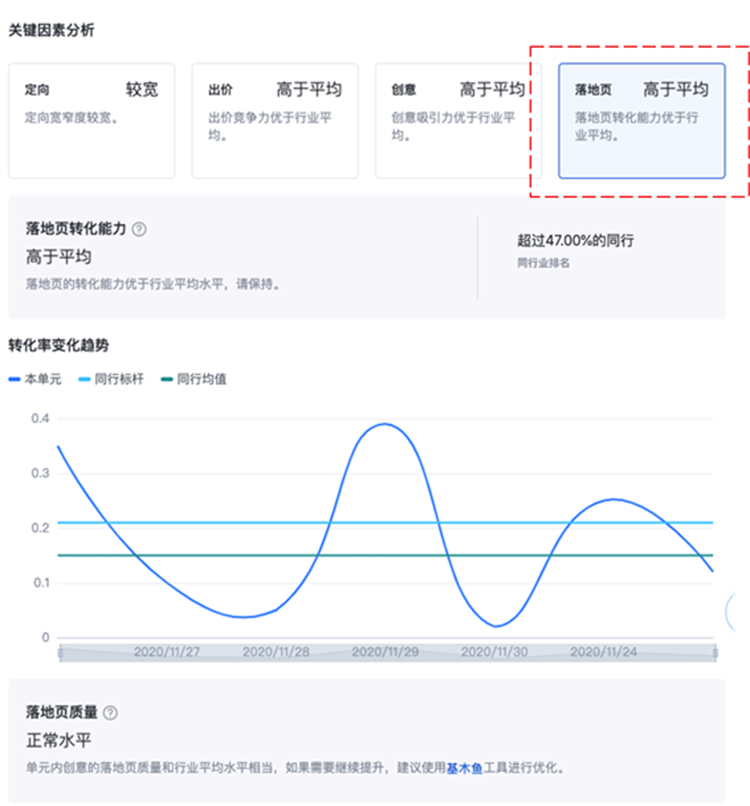 落地页:落地页分析与结论,披露落地页转化获取能力,支持同行标杆、同行均值对比趋势图(落地页获取转化能力是该单元落地页转化效果指标,通过绝对值及同行业排名,定位转化率表现情况;落地页质量是对当前单元所投放的落地页素材质量、用户体验进行综合分析评估的指标,分析结论反映最近该单元的落地页质量在百度系媒体投放时的综合表现)