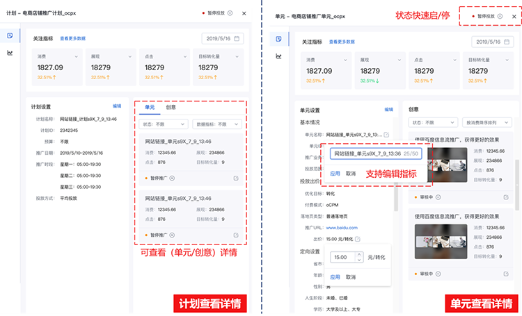 查看详情内设置的计划/单元基础信息,与推广管理物料列表、主流程内进行的操作一致