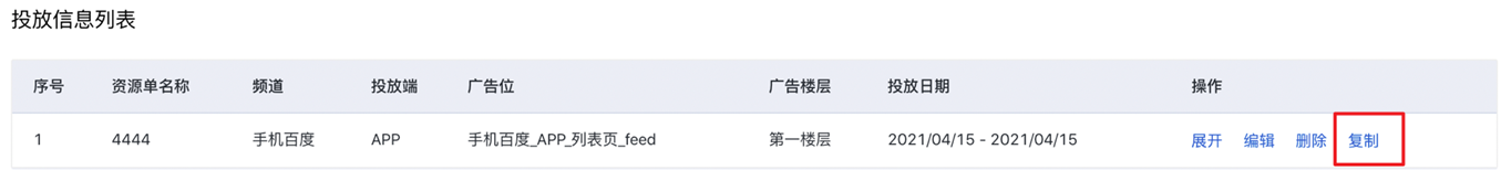 需注意,已经提交询量的询量单不能再操作资源单复制,对于品牌impact类的订单,复制后会清空开屏计划ID,但保留开屏计划类型选项。