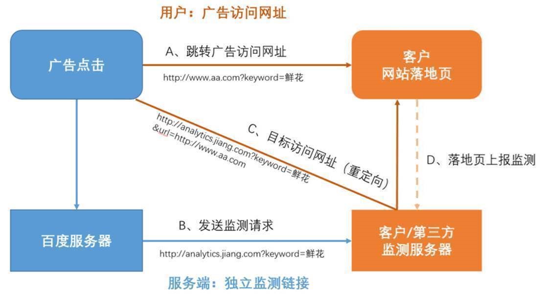 随着营销科学的普及,不少广告客户希望能够将广告获客的全链路信息进行精确的量化分析,以便更好地优化广告投放效果。这就要求将用户在媒体上点击广告的行为、和用户点击广告后进入广告落地页、深入广告主经营私域中的一系列行为进行精确的拼接。但在某些情况下,用来承载广告推广内容的推广落地页和进行用户行为统一监测分析服务之间较难即时互通信息,(例如,对于应用推广场景,广告推广落地页是基木鱼下载页,而用户点击广告时的信息需要发送到客户的监测服务地址),因此需要配置推广落地页网址之外的监测地址,以便在广告点击时刻监测分析服务器能够及时收到本次广告的监测信息,完成后续的用户行为链路拼接分析。在广告点击时刻接收监测信息的地址,称为点击监测地址。 之前百度搜索推广仅允许客户在转化追踪中设置点击监测地址,需要搭配oCPC投放使用。 应客户要求,本次搜索广告投放平台升级,允许在账户层级设置点击监测地址,当推广计划并未使用转化追踪时,使用点击监测功能。