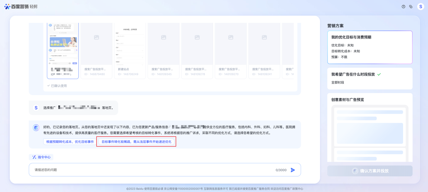 轻舸,依托文心产业级知识增强大模型,以海量数据和大规模知识为底座,通过生成式AI贯通营销方案表达和广告投放优化;轻舸平台可以通过自然语言交流,无衰减传达企业营销策略,实现"自由表达";全流程操作高效便捷,prompt直连引擎极速广告呈现,实现"简单投放";同时持续扩展集成最新AI能力,"无限扩展"优化能力;赋能投前-投中-投后最佳实践,助力企业用最便捷的方式达到最理想的营销效果。